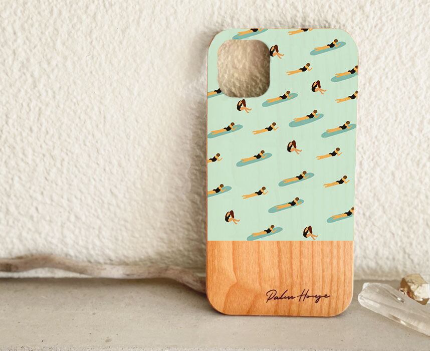 ビーチにいる人とサーファーを描いた、シンプルで少し個性的なデザインです。