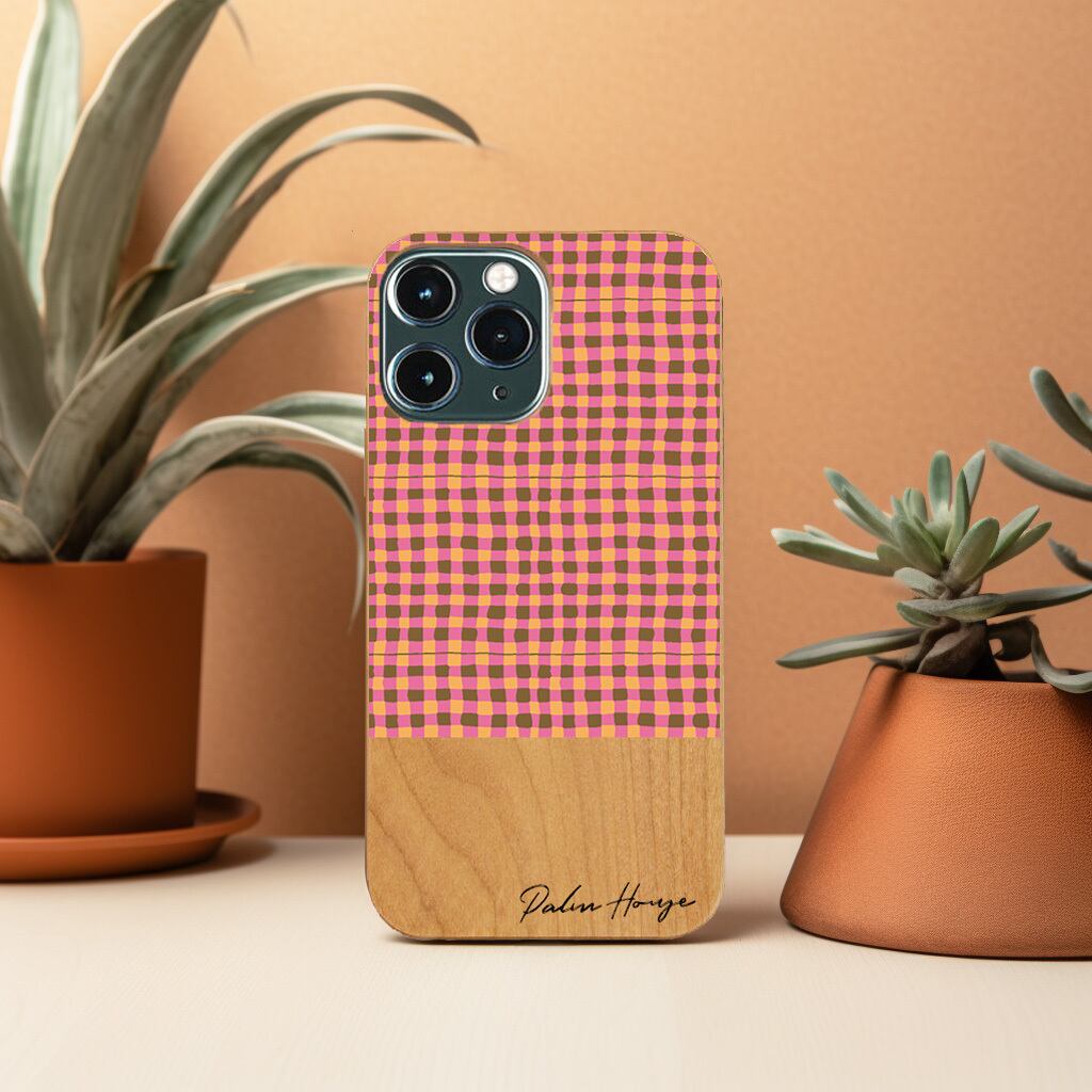 天然木の風合いと可愛らしいピンクオレンジのチェック柄が魅力のiPhoneケースです。