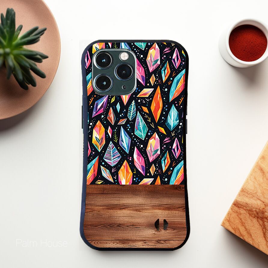 ブラックのベースカラーにカラフルに輝く宝石が散りばめられた、クリスタル柄が特徴です。