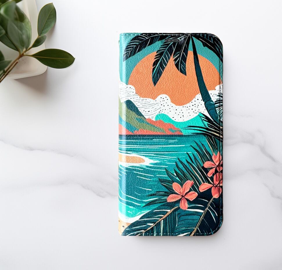 大きく配置された太陽のデザインがインパクトがあり、鮮やかな色彩のケースです。