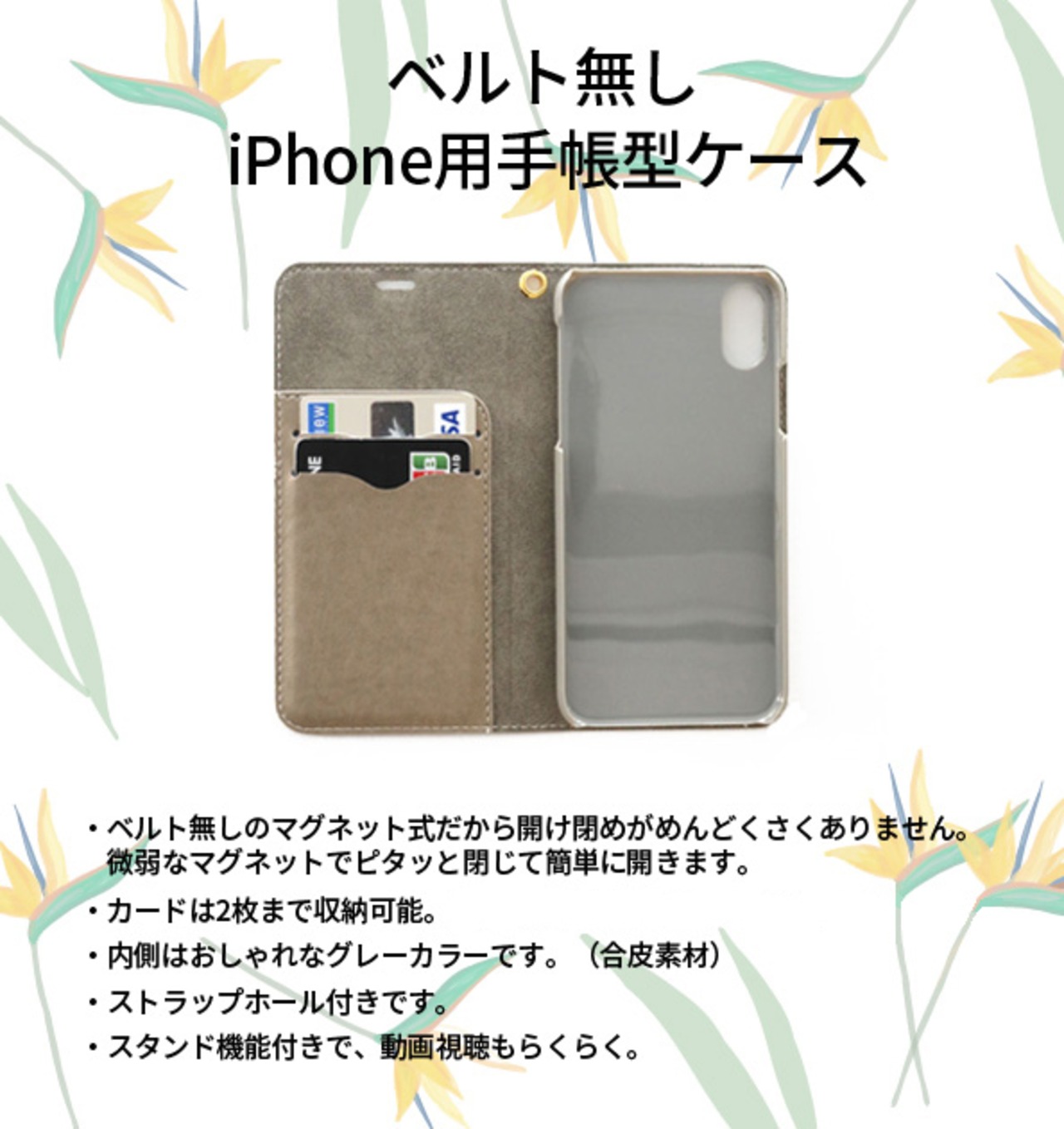 こちらはベルト無しタイプのiPhone手帳型ケースとなります。