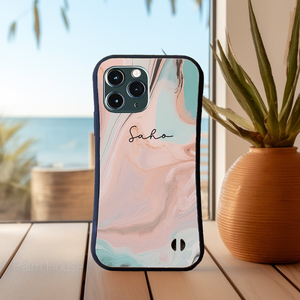 ベージュピンクに少しのブルーが混ざりあった、とても綺麗なカラーのケースです。