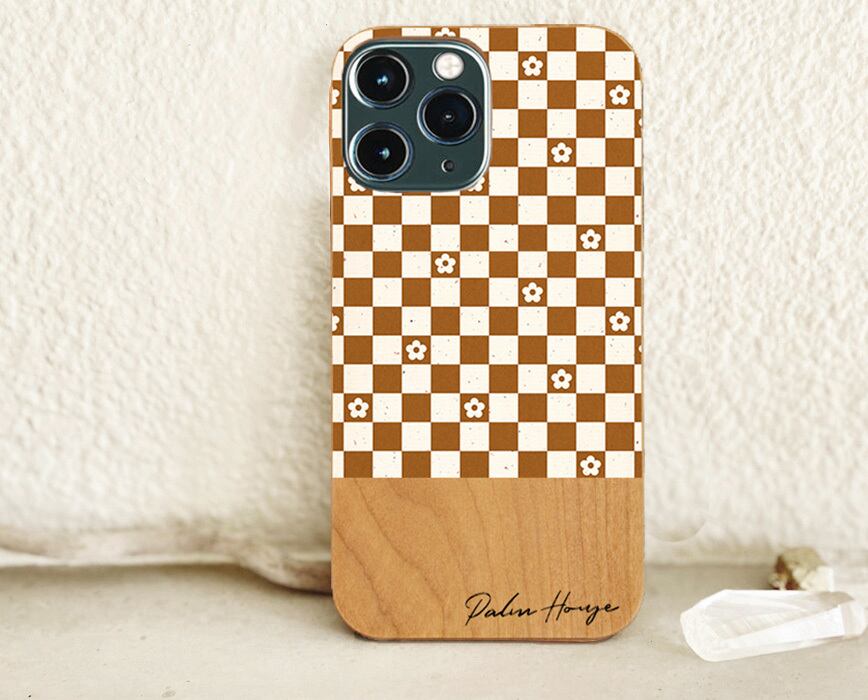 ブラウンのちょっとレトロな細かいチェッカー模様とお花を天然木のケースと合わせました。